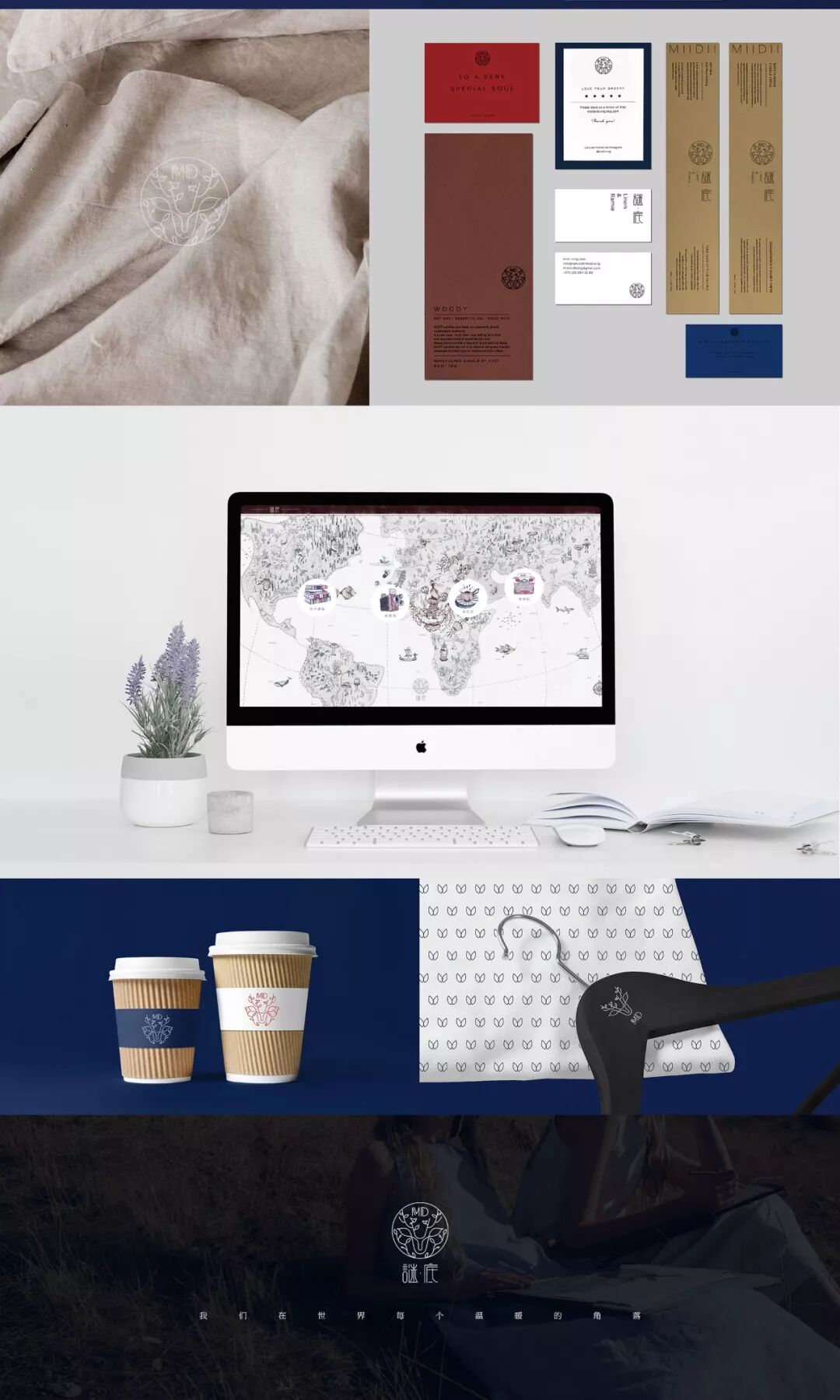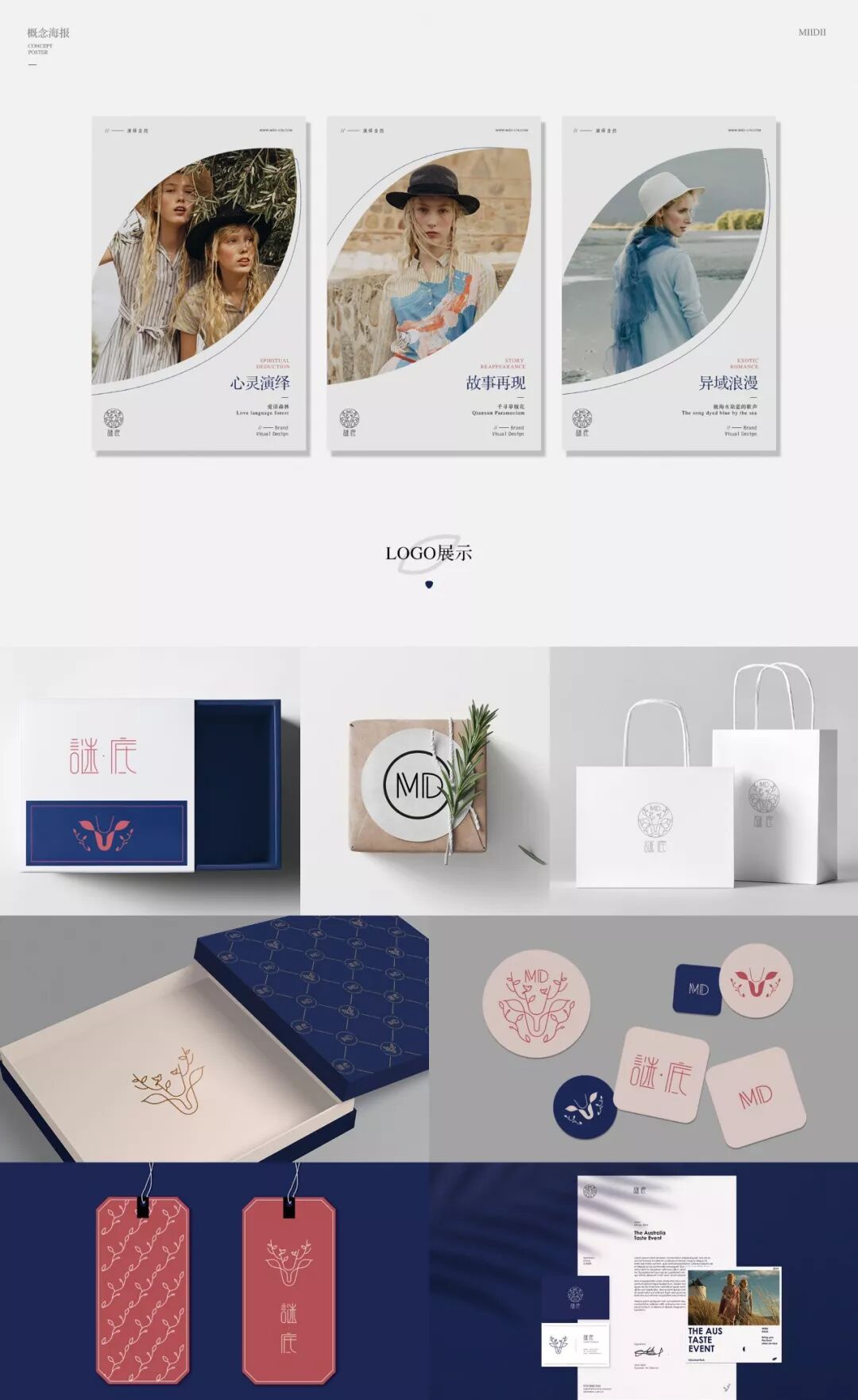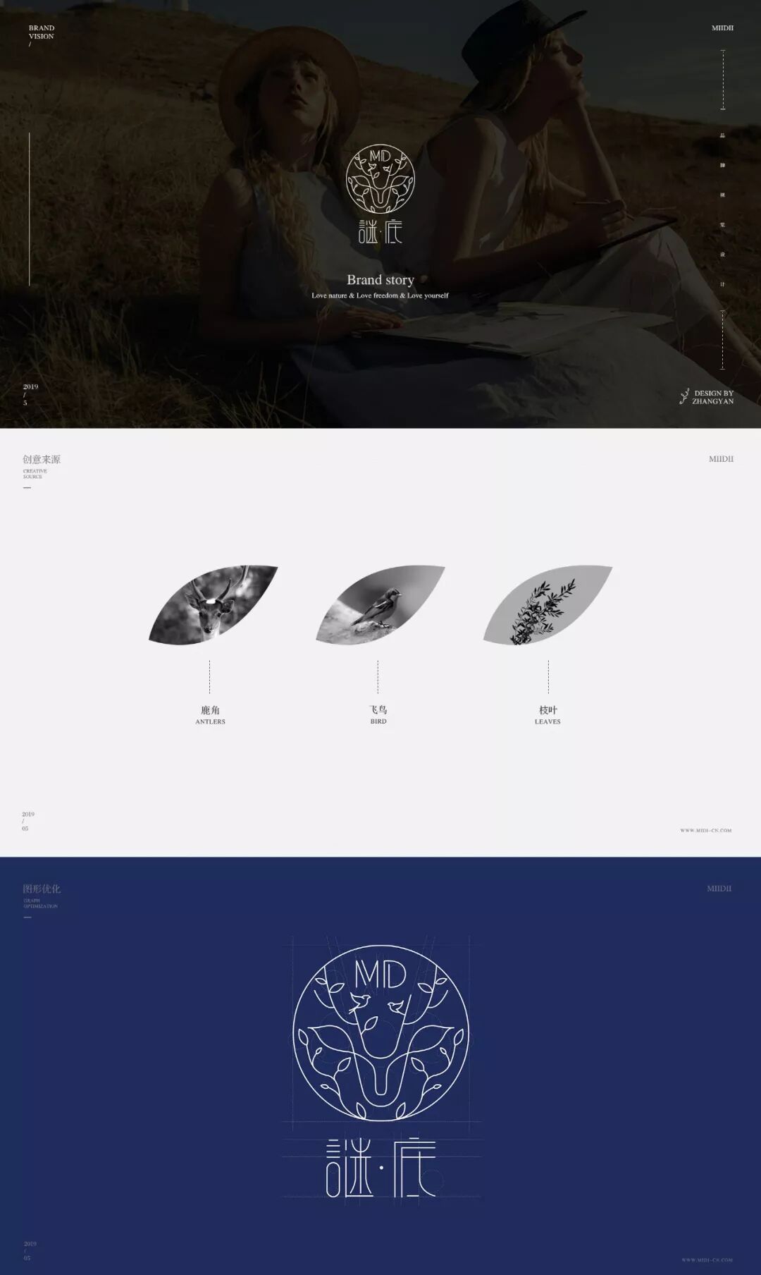 该作品是学员为“谜底”服装品牌设计的视觉识别,倡导时尚与自然融为一体,倡导环保。LOGO以鹿角、飞鸟、树枝为创意点,达到了标识最佳视觉效果,向消费者传递该品牌的时尚、自然、优雅的理念。