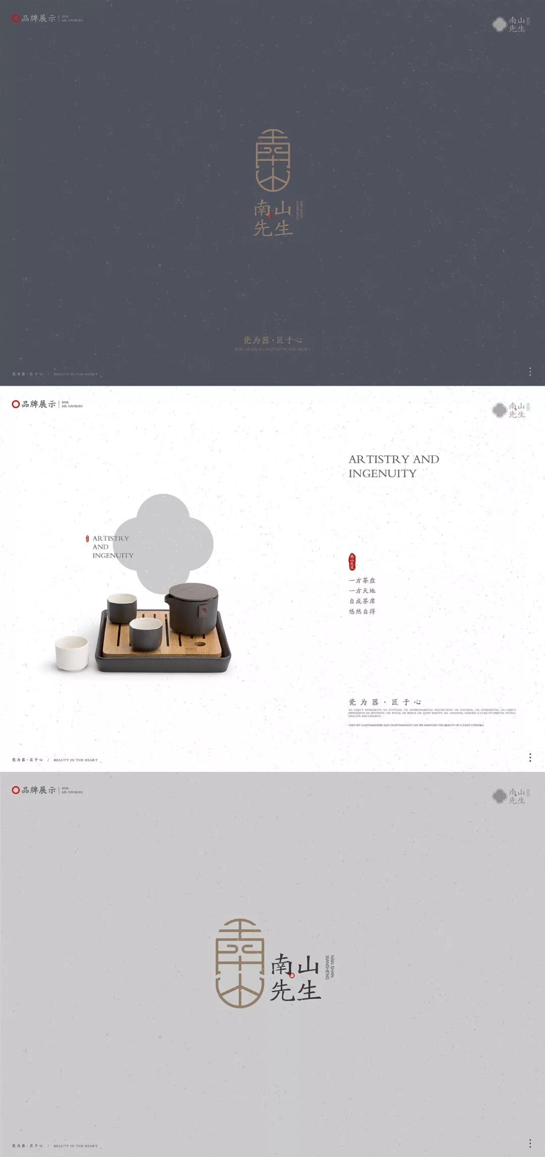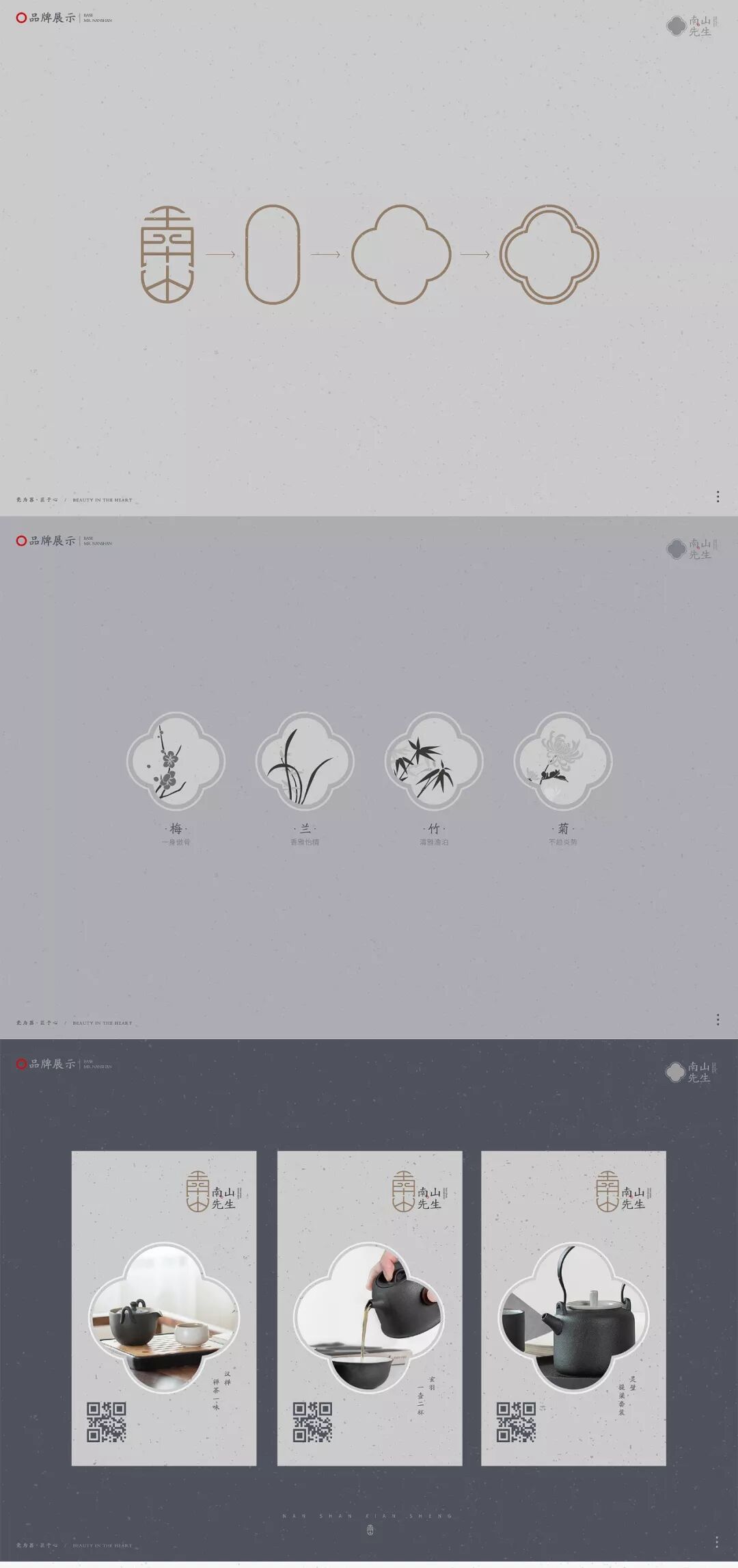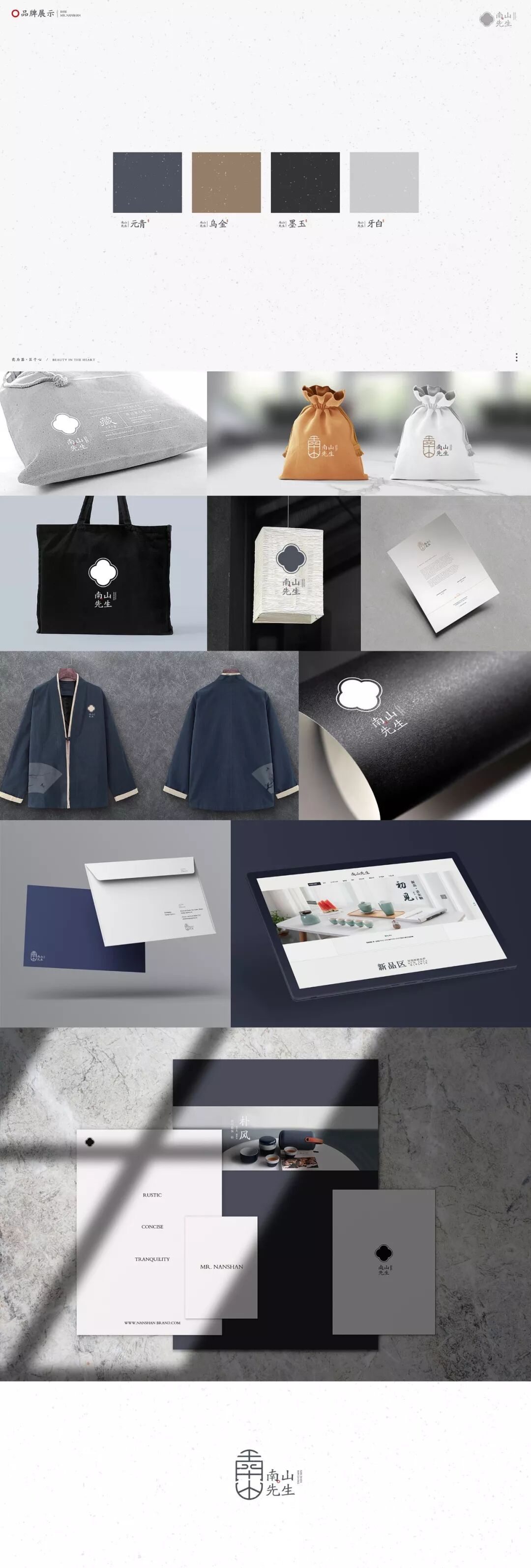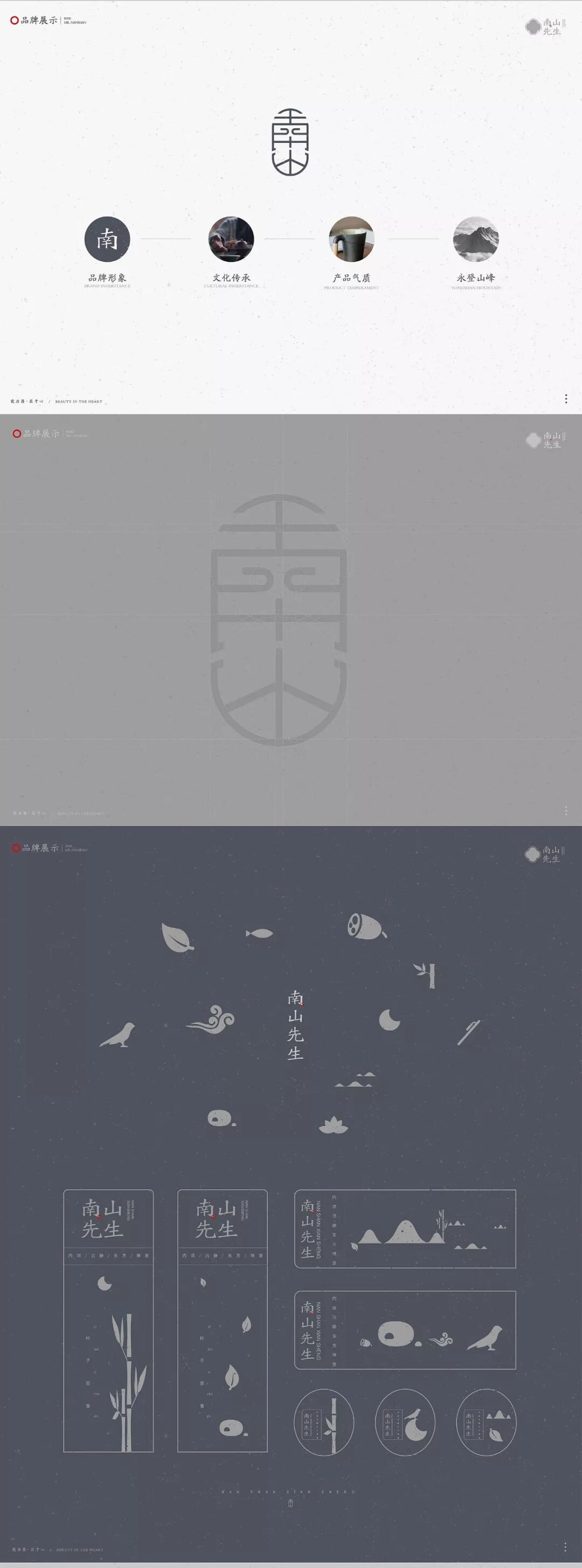 LOGO是根据汉字“南山”与中国传统的装饰符号相结合,品牌色运用了元青、乌金、墨玉、牙白这四种中国传统颜色,以表现一种内敛沉静的文化背景的形象。整个品牌的包装设计是充满古朴的风味和独特的东方禅意。