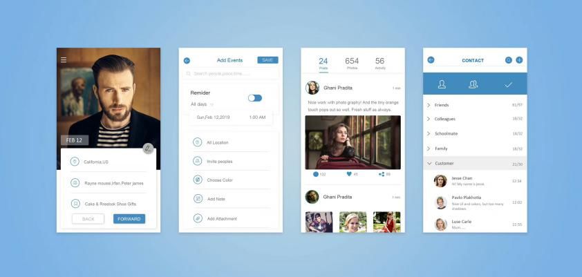 这一套界面设计极简却又不失视觉冲击力,白色底版加灰色文字再加以重点的蓝色点缀,这种将明亮的主色添加到大面积的灰色调中的自定义配色方案,非常吸引人眼球。