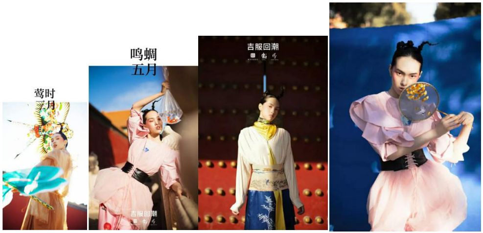 为了展现传统与现代的完美融合,在服装改良的基础上,还运用了帝王御用色-明黄,紫禁城建筑代表色-琉璃黄,宫墙门窗色-朱红,宫廷发饰色-翠蓝,宫廷服饰色-石青、漆黑、宝蓝、藕荷色。这些色彩大多热烈高贵凸显了身份的象征,有的又清冷纯粹凸显了情趣的雅致。