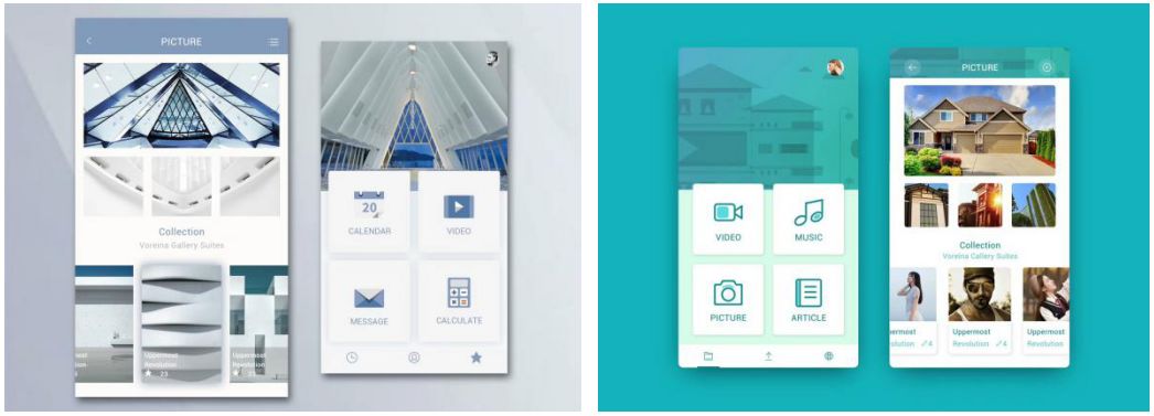 这两个界面设计视觉上给人以简洁干净的效果,主要运用到了在单色配色中非常有代表性的蓝色、绿色的单色配色方案,通过调整单一色系的明暗、深浅、饱和度,产生和谐的有明暗层次的效果。